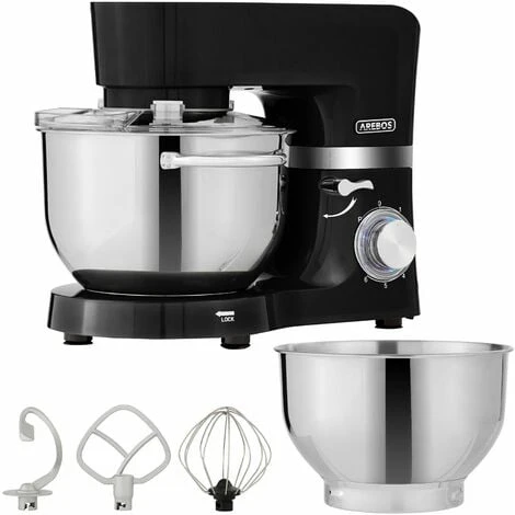 【Quick and convenient anti-slip design】The AREBOS food mixer includes several accessories: whisk, dough hook, and beater. The built-in blue LED light indicates the 6 different speed settings, such as for whisking eggs, kneading dough and many more functions. 5 anti-slip feet ensure quiet and secure footing during operation.