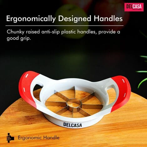 ERGONOMICALLY DESIGNED HANDLES Features chunky raised anti-slip plastic handles, which provide a good grip and stop your knuckles hitting worktops as you push down. Can be used for most medium-sized fruits that are round in shape