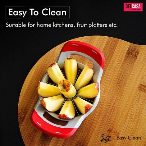 EASY TO CLEAN Just use warm soap water to rinse the slicer or use the dishwasher to clean .Suitable for home kitchens, fruit platters etc. saving you time. It cuts the fruit into 8 uniform slices in one simple motion