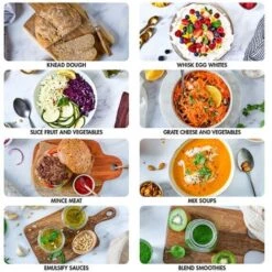 4200XL CAPACITIES – Bread dough – 1kg; Pastry – 1.2kg; Blending – 1.3L; Chopping (meat) – 1kg; Grating (carrots) – 1kg; Egg whites: 6.