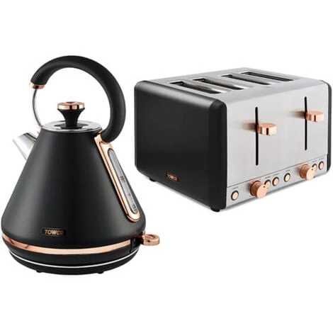 The Tower Cavaletto black set contains a 1.7 litre pyramid kettle and a 2 slice stainless steel toaster.