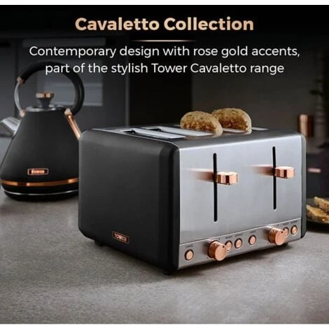 The Tower Cavaletto black 4 slice stainless steel toaster has a contemporary matt black finish with elegant rose gold accents adding style to your kitchen and fits in with the coordinating Cavaletto range (sold seperately).