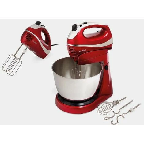 VonShef 2 In 1 Twin Hand & Stand Mixer – 300W Electric, Multifunctional, Red Mixer With 5 Speeds & Turbo Button, 3.5L Bowl & Removable, Dishwasher Safe Attachments (2X Beaters, 2X Dough Hooks & Whisk)